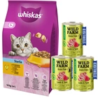 WHISKAS Hrană uscată pentru pisici 1+ cu pui 14kg+WILD FARM Pate cu pui 3x400g